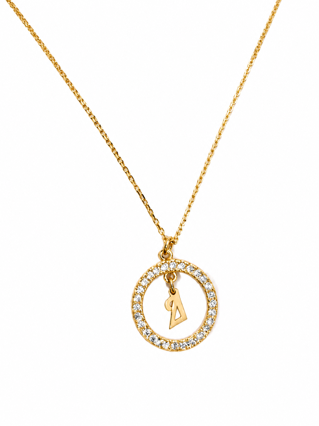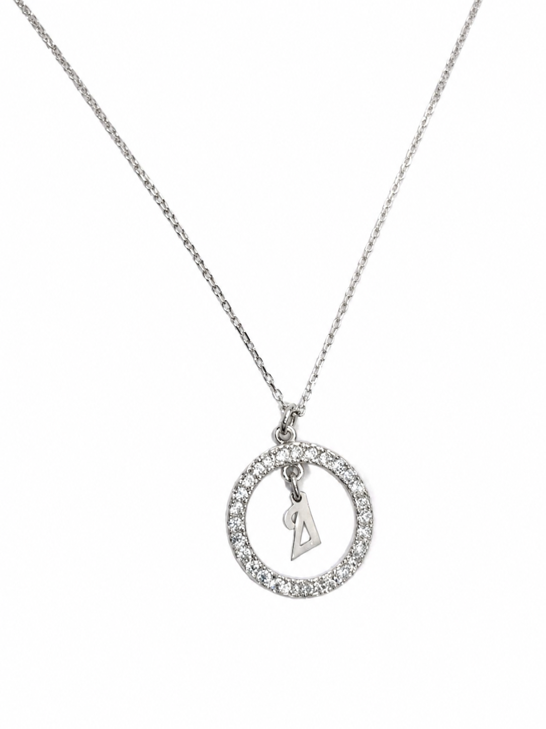 Κολιέ Ασημένιο 925 επιχρυσωμένο κύκλος με λευκές πέτρες ζιργκόν και μονόγραμμα “Δ”