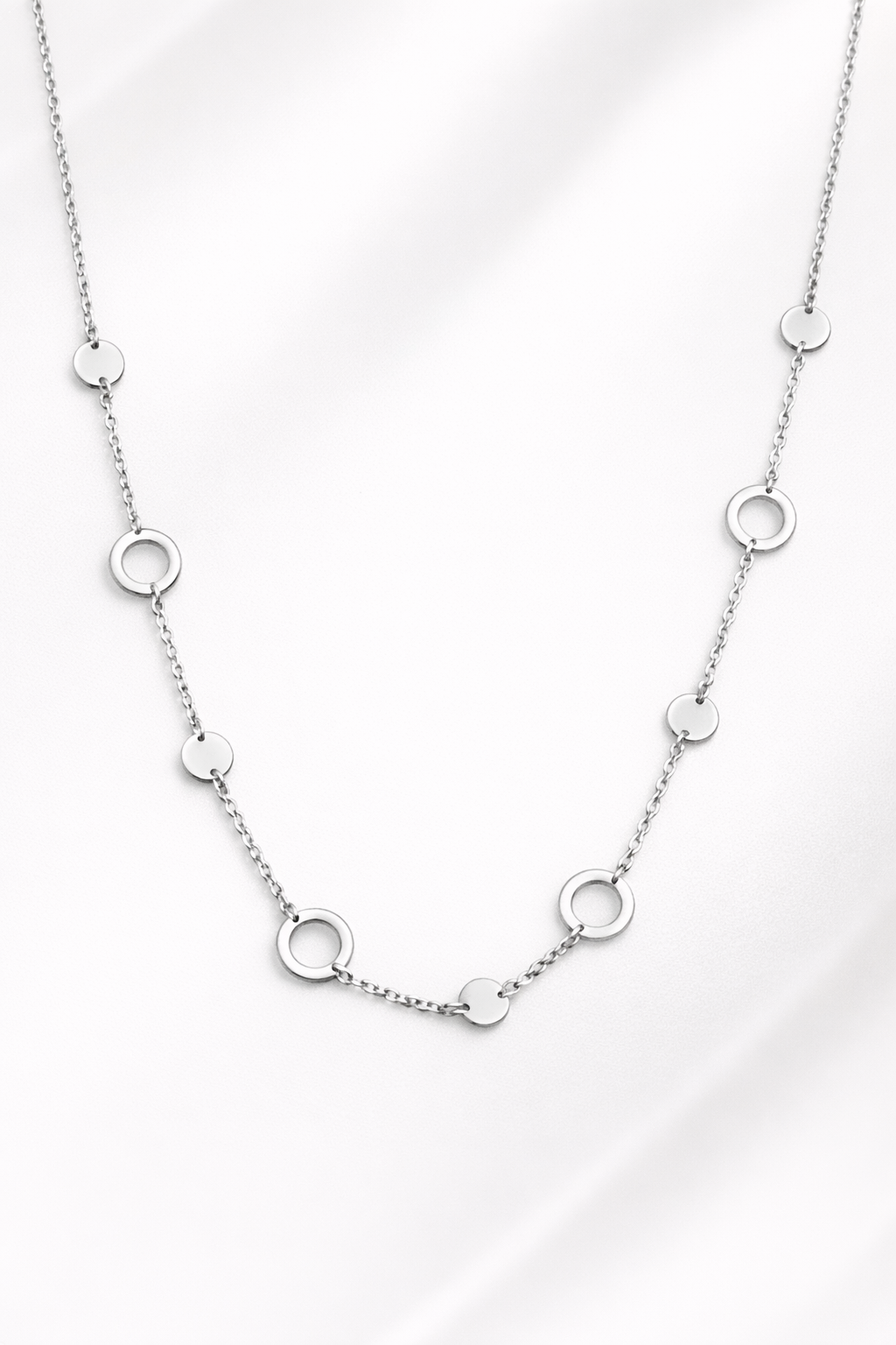 Κολιέ ασημένιο 925 επιχρυσωμένο λεπτεπίλεπτο κολιέ από λευκό μέταλλο με μοντέρνο και διαχρονικό σχεδιασμό διακοσμημένο με εναλλαγή από διακριτικούς κύκλους και μικρές στρόγγυλες πλάκες.