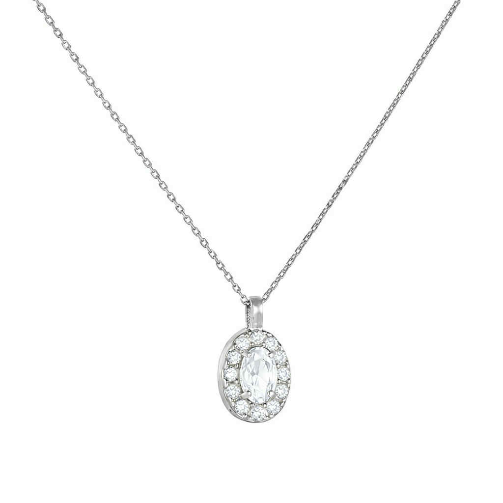 Κολιέ λευκόχρυσο Κ14 ροζέτα οβάλ με κεντρική λευκή πέτρα ζιργκόν και λευκές περιμετρικά