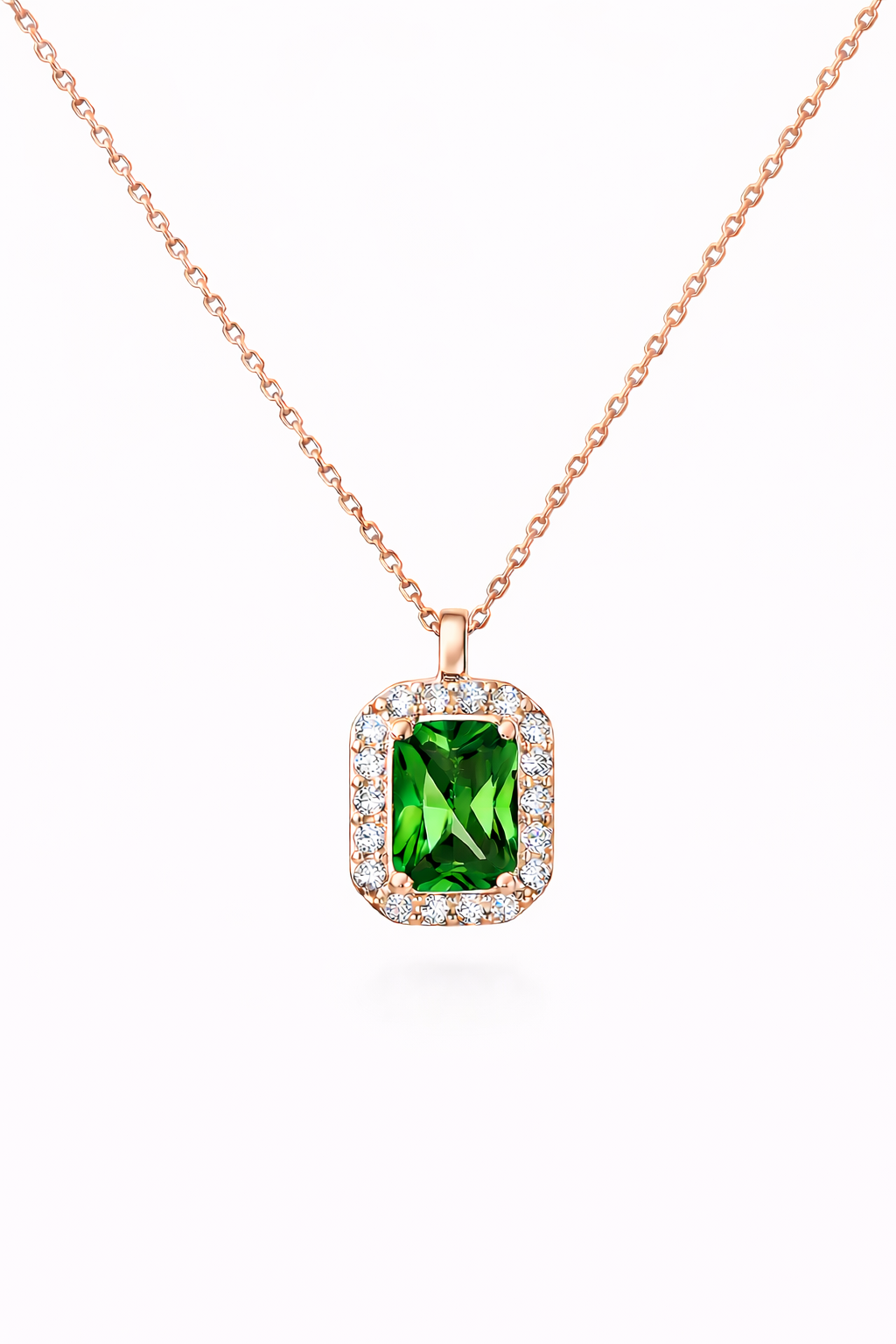 Κολιέ λευκόχρυσο 14K ροζέτα ορθογώνια με πράσινη πέτρα ζιργκόν στο κέντρο και λευκές στρόγγυλες περιμετρικά
