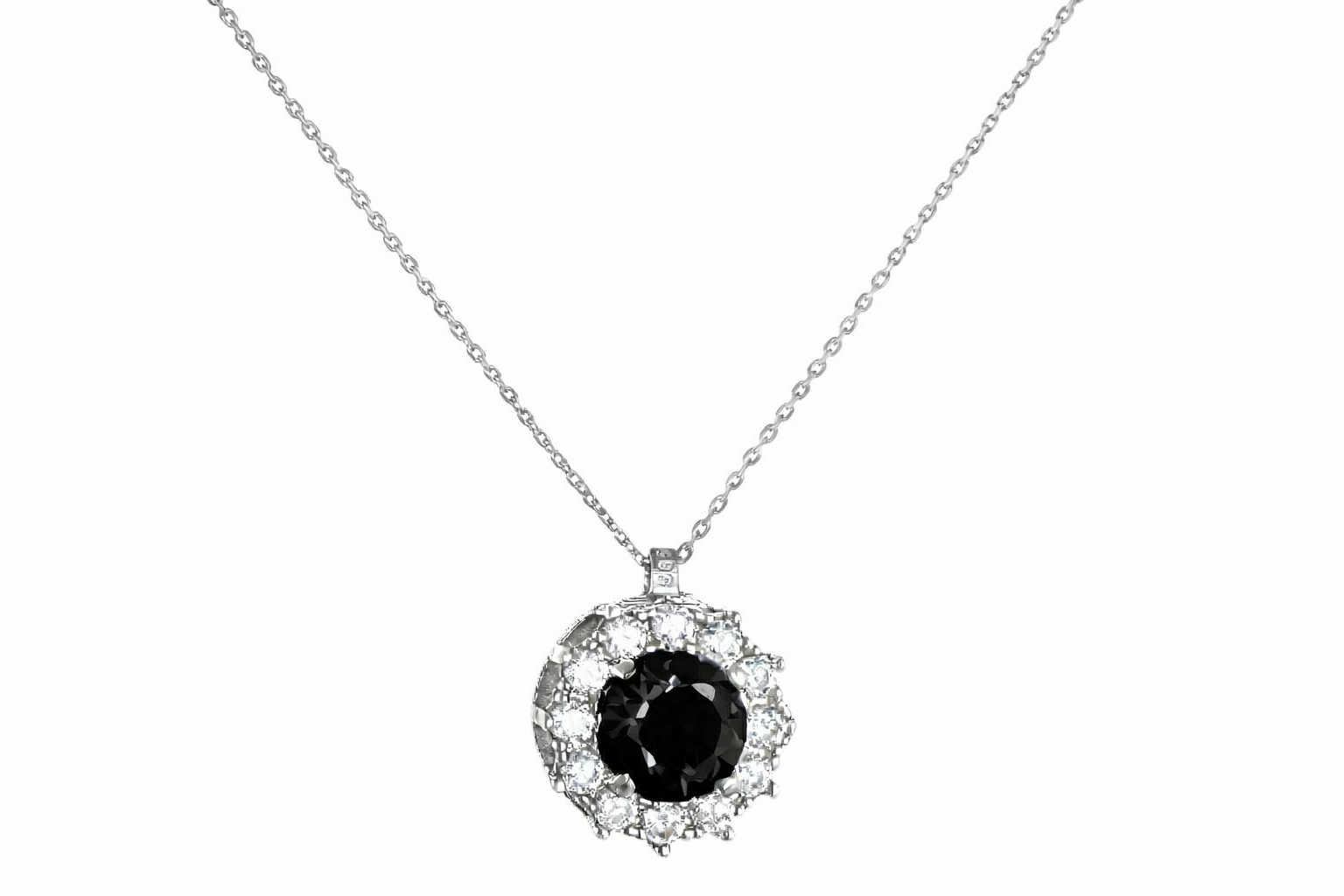 Κολιέ λευκόχρυσο 14Κ στρόγγυλη Ροζέτα με μαύρη πέτρα ζιργκόν στο κέντρο και λευκές περιμετρικά.