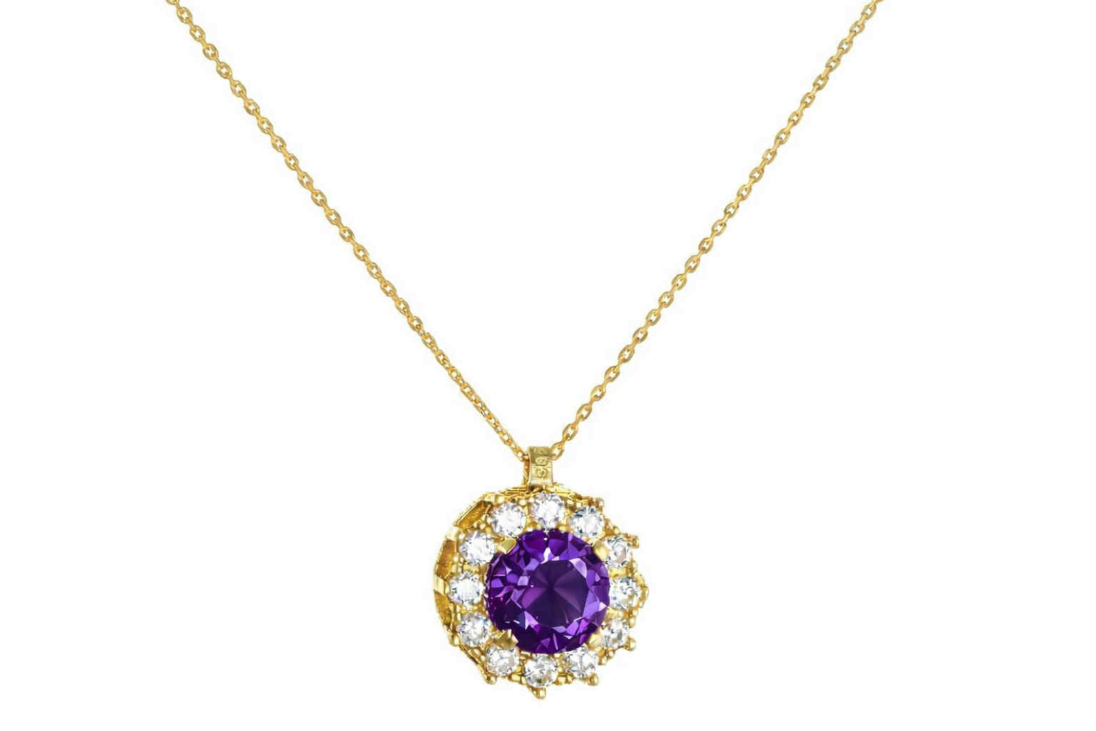 Κολιέ χρυσό 14Κ στρόγγυλο  με γαλάζια πέτρα ζιργκόν στο κέντρο και λευκές περιμετρικά.