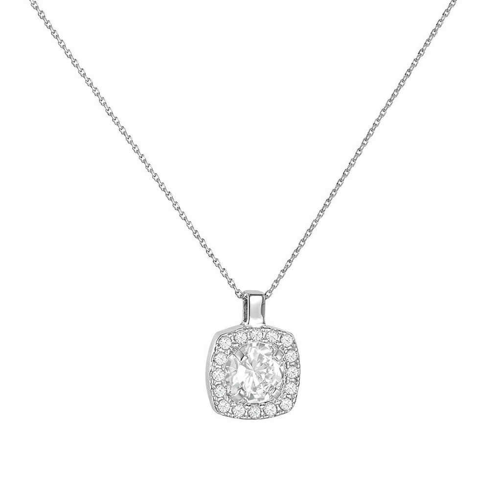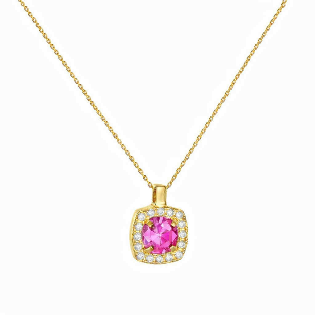 Κολιέ χρυσό 14K ροζέτα τετράγωνη με στρόγγυλη κεντρική ροζ πέτρα ζιργκόν και λευκές περιμετρικά