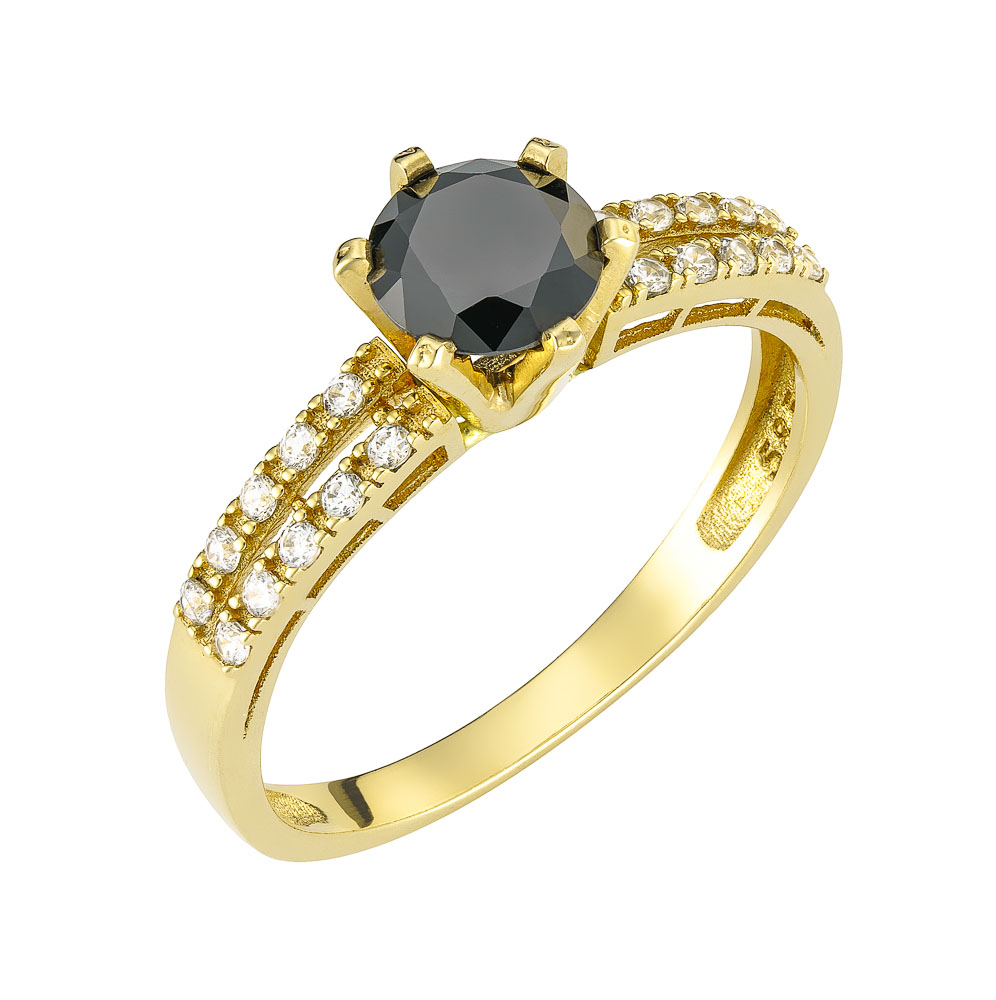Δαχτυλίδι χρυσό μονόπετρο 14Κ με κεντρική μαύρη πέτρα ζιργκον και πλαϊνές λευκές.