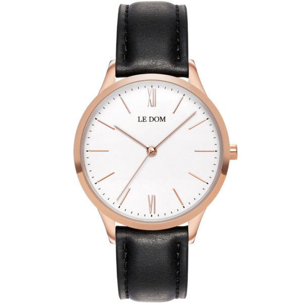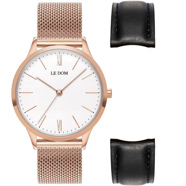 Γυναικείο ρολόι Le Dom σετ με ροζ χρυσό μεταλλικό μπρασελέ & μαύρο δερμάτινο λουρί.