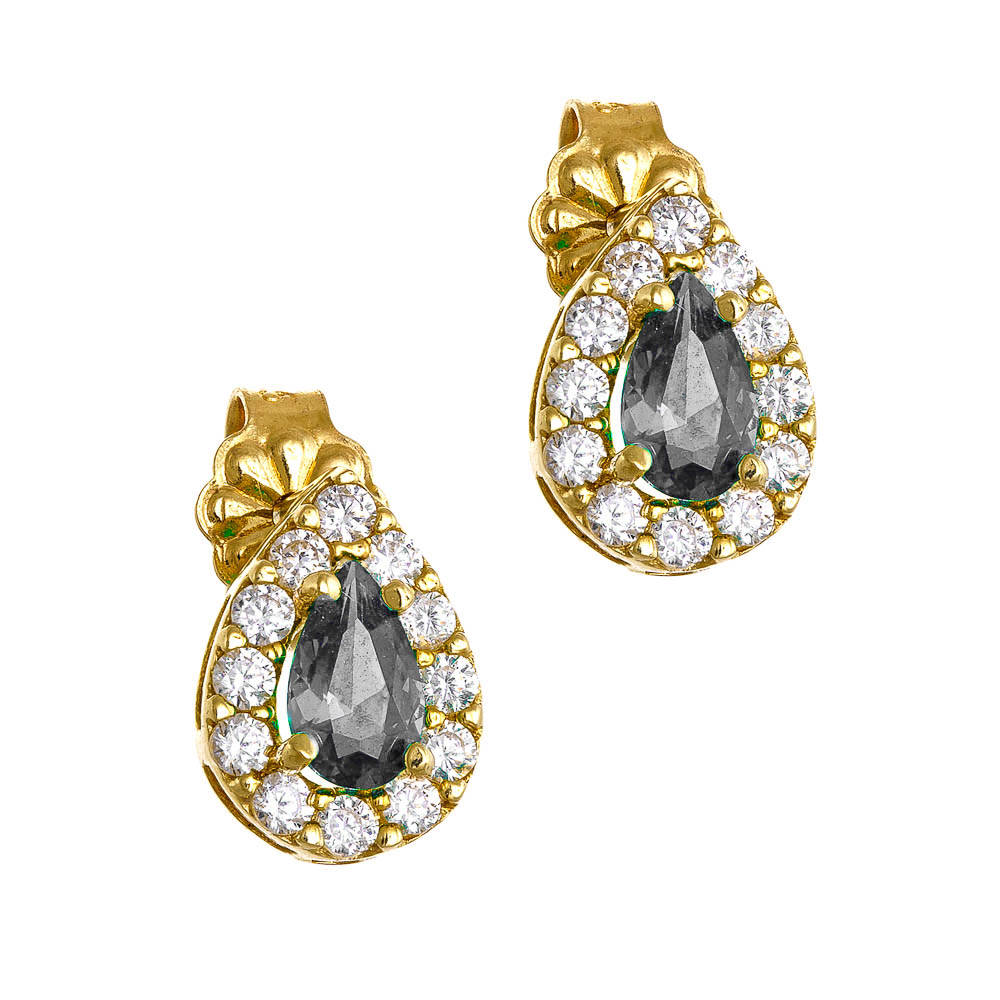 Σετ χρυσό 14Κ ροζέτα σε σχήμα δάκρυ με μαύρη πέτρα στο κέντρο και λευκές στρόγγυλες περιμετρικά .