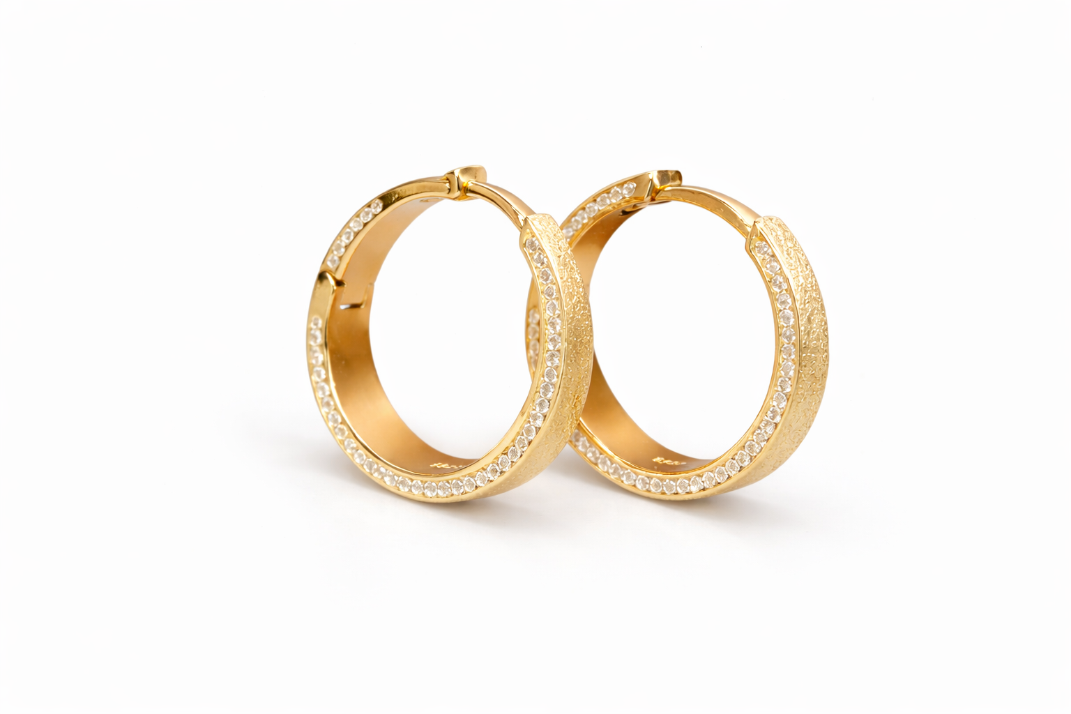 Σκουλαρίκια κρίκοι ασημένια 925 επιχρυσωμένα με ιδιαίτερη ματ υφή και διακριτική σειρά από λευκές πέτρες ζιργκόν στο εξωτερικό και στο εσωτερικό του.