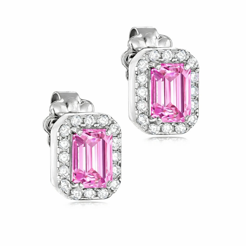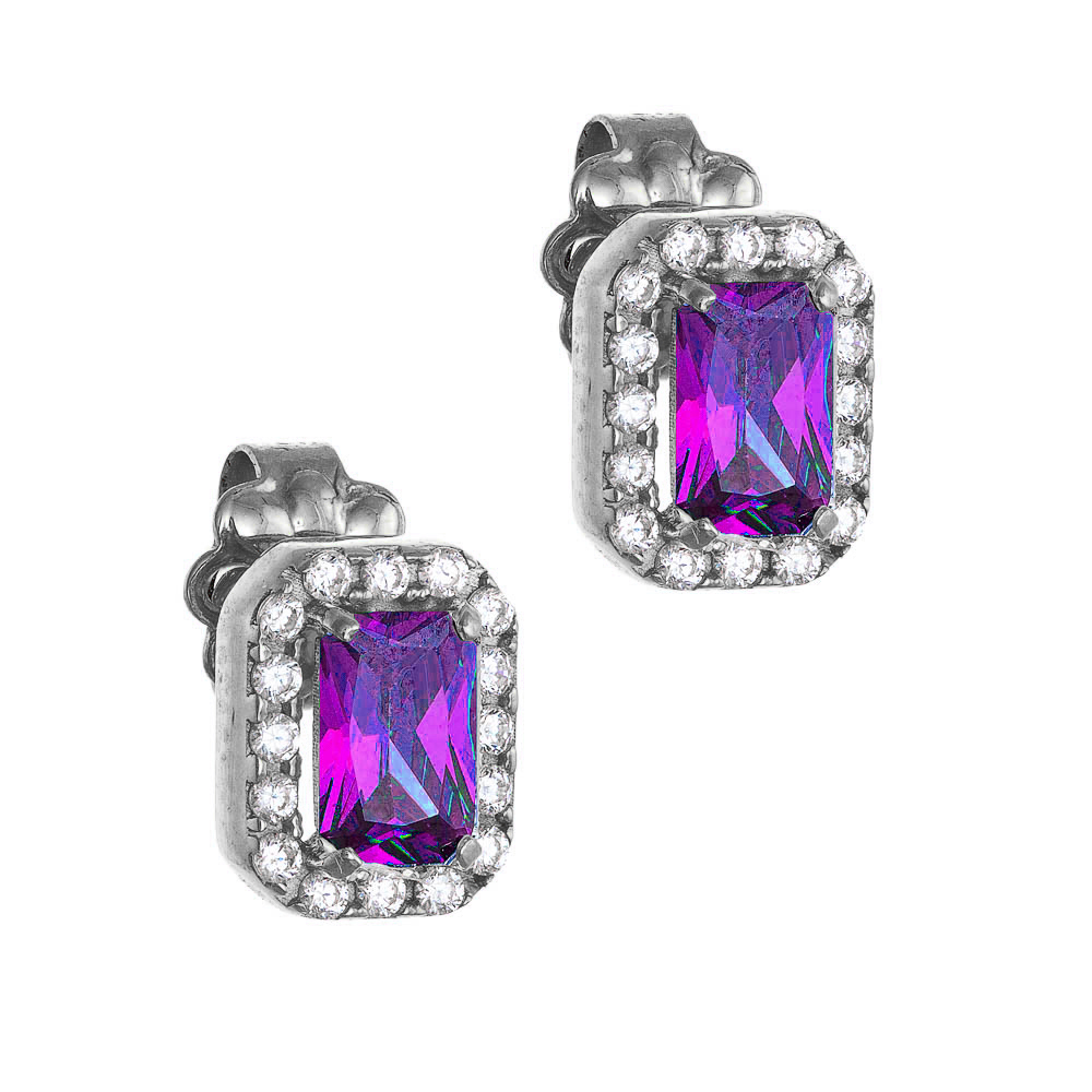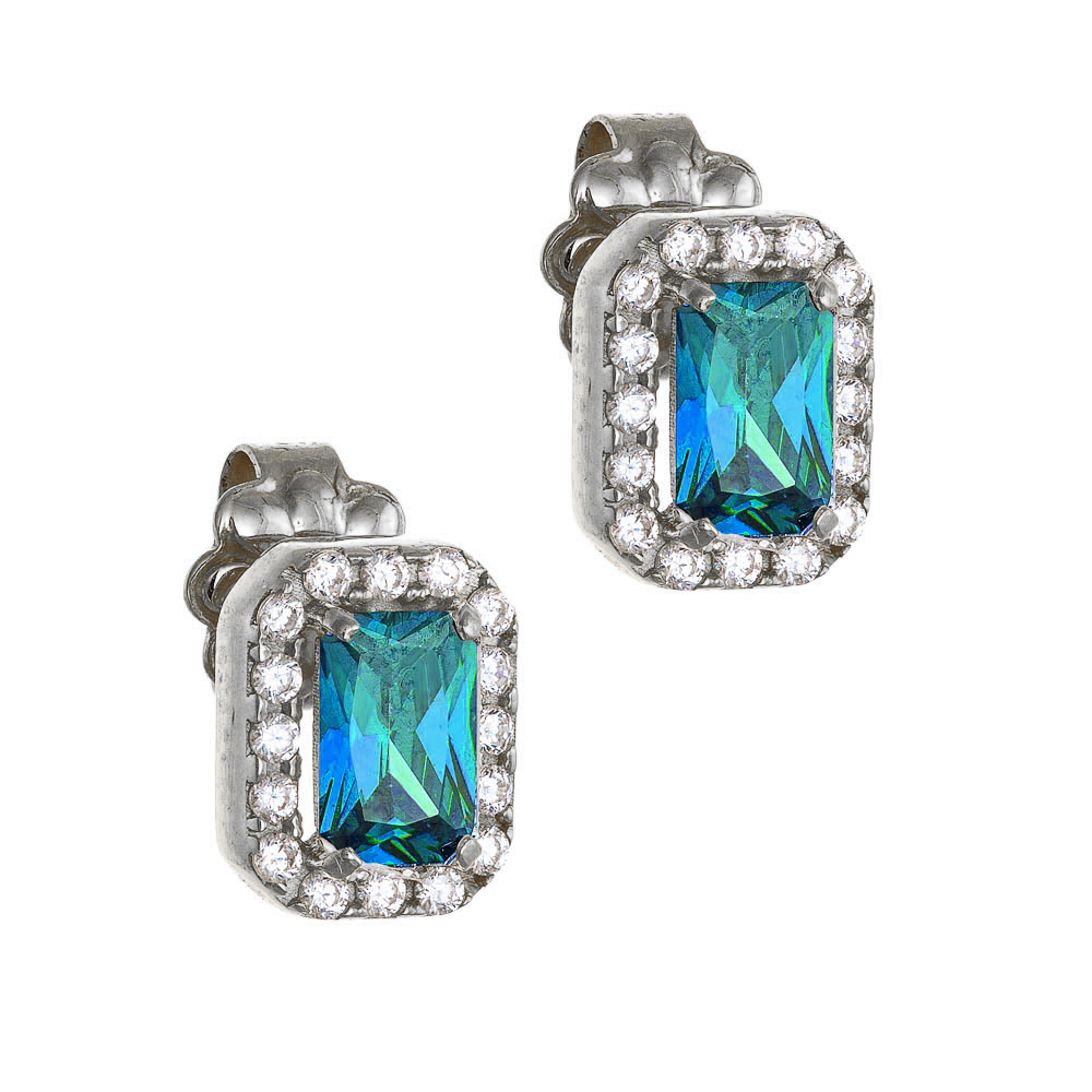 Σκουλαρίκια λευκόχρυσα Κ14 ορθογώνια Με Γαλάζια Πέτρα Ζιργκόν Σε Κοπή Baquette & Λευκές Στρόγγυλες Περιμετρικά