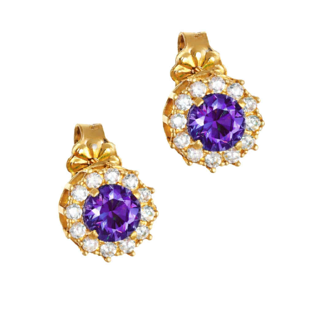 Σκουλαρίκια χρυσά Κ14 ροζέτα με στρόγγυλη γαλάζια πέτρα στο Κέντρο και Λευκές Περιμετρικά