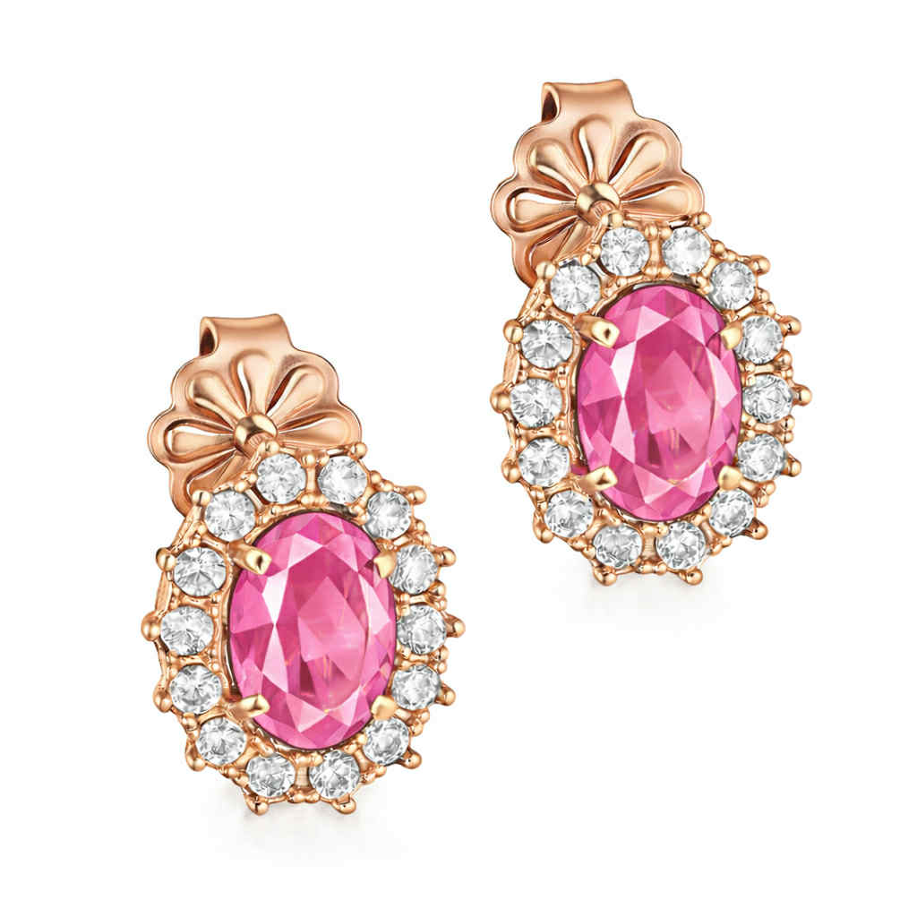 Σκουλαρίκια Rosegold Κ14 Ροζέτα Οβάλ Με Γαλάζια Πέτρα ζιργκόν στο Κέντρο και Λευκές περιμετρικά