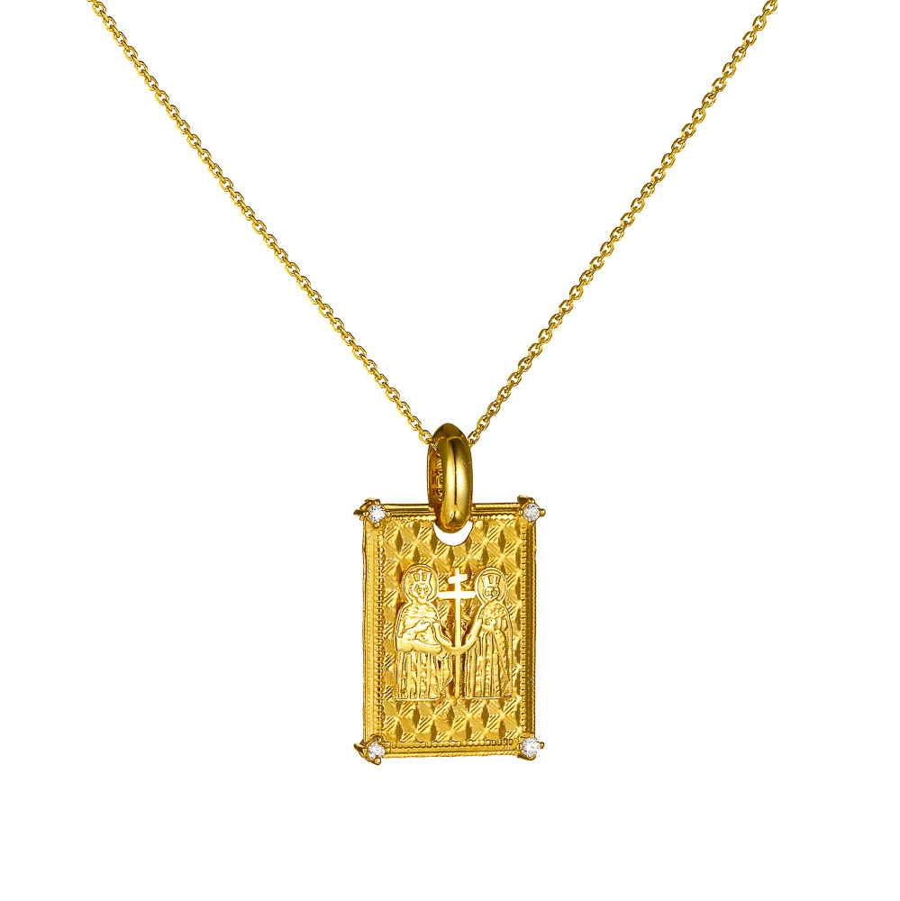 Φυλαχτό κωνσταντινάτο ορθογώνιο διπλής όψης με αλυσίδα χρυσό 14Κ και λεπτομέρειες από διακριτικές λευκές πέτρες ζιργκόν
