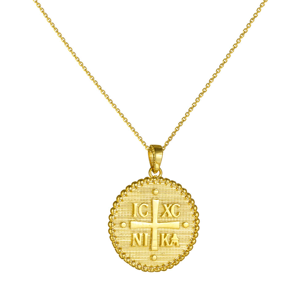 Φυλαχτό στρόγγυλο με αλυσίδα χρυσό 14Κ , ένα εκλεπτυσμένο κωνσταντινάτο με ανάγλυφη διπλή όψη και περίτεχνη στεφάνη.