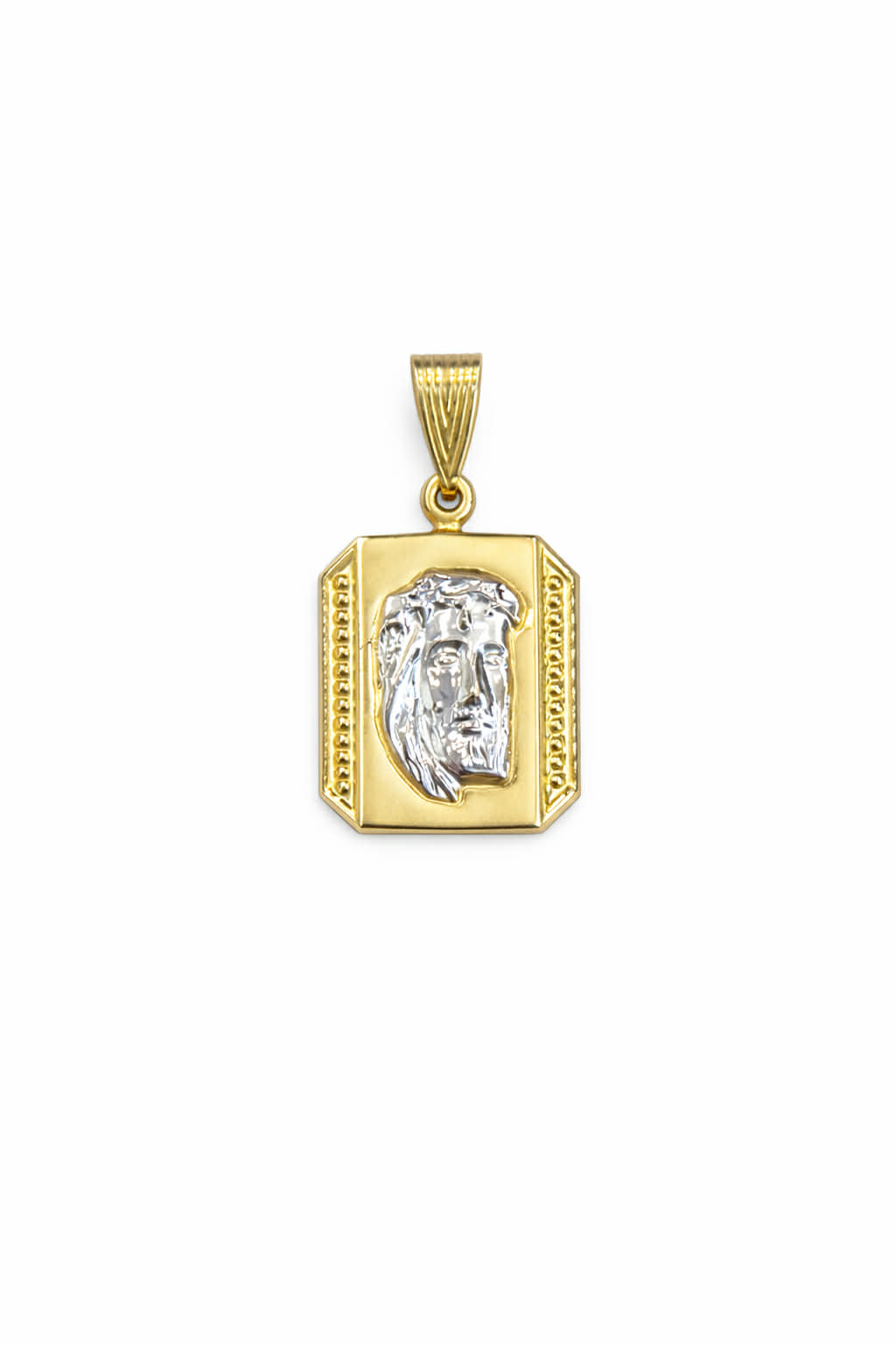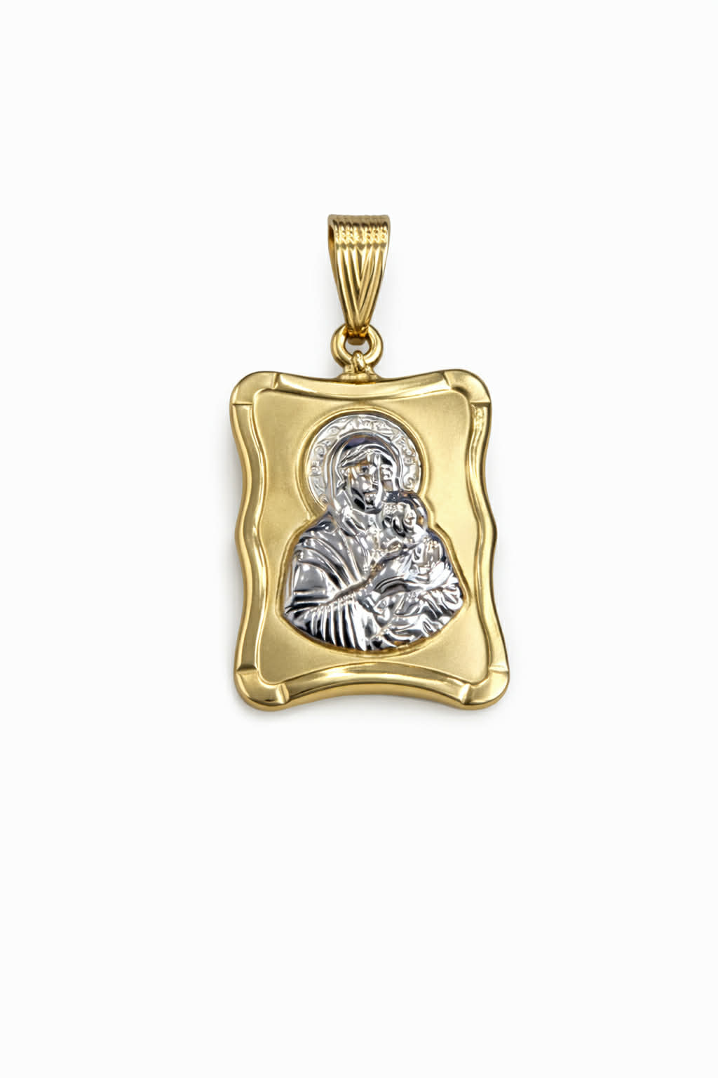 Φυλαχτό μενταγιόν χρυσό Κ9 με απεικόνιση την Παναγία, σε διχρωμία χρυσού και λευκού μετάλλου.